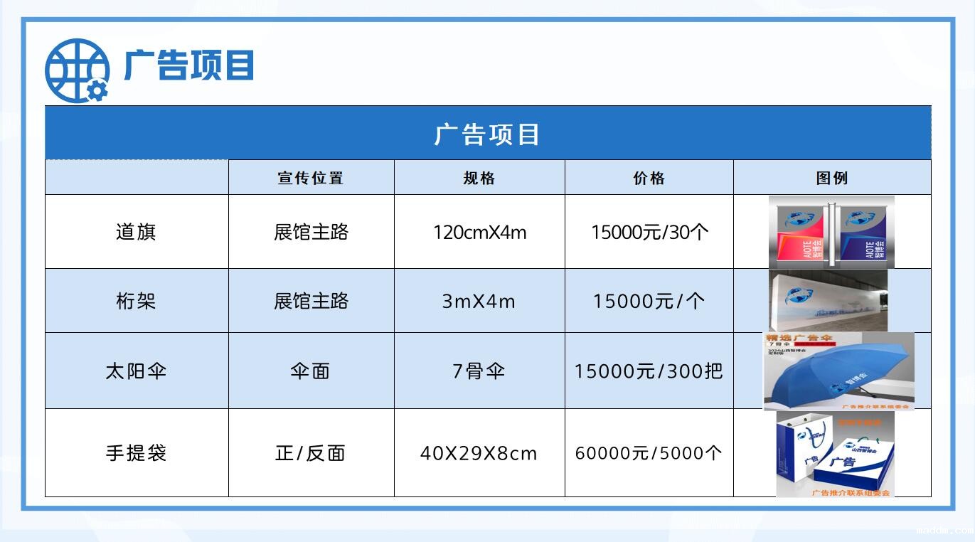 1、标准展台:3㎡×3㎡=9㎡;标准展位:18800RMB/个;国际展商:3000USD/个;标准展位包括地毯、三面围板、公司名称楣板、咨询桌一张、椅子两把、射灯两盏、电源插座一个(特殊用电请事先说明,展馆另行收费)。